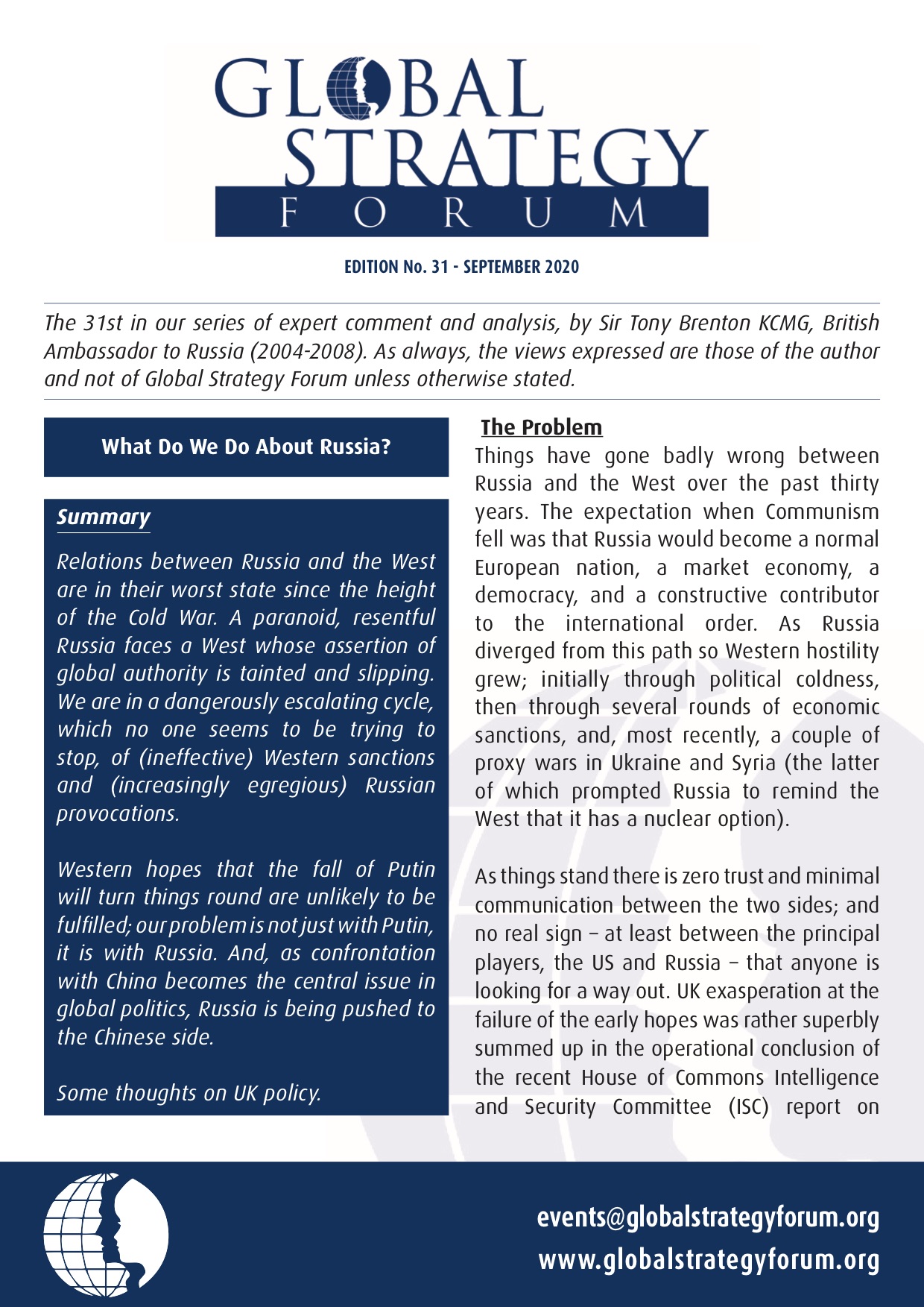 We are delighted to publish the 31st in our series of expert comment and analysis by Sir Tony Brenton, British Ambassador to Russia (2004-2008). As always, the views expressed are those of the author and not of GSF unless otherwise stated. Continue reading →
