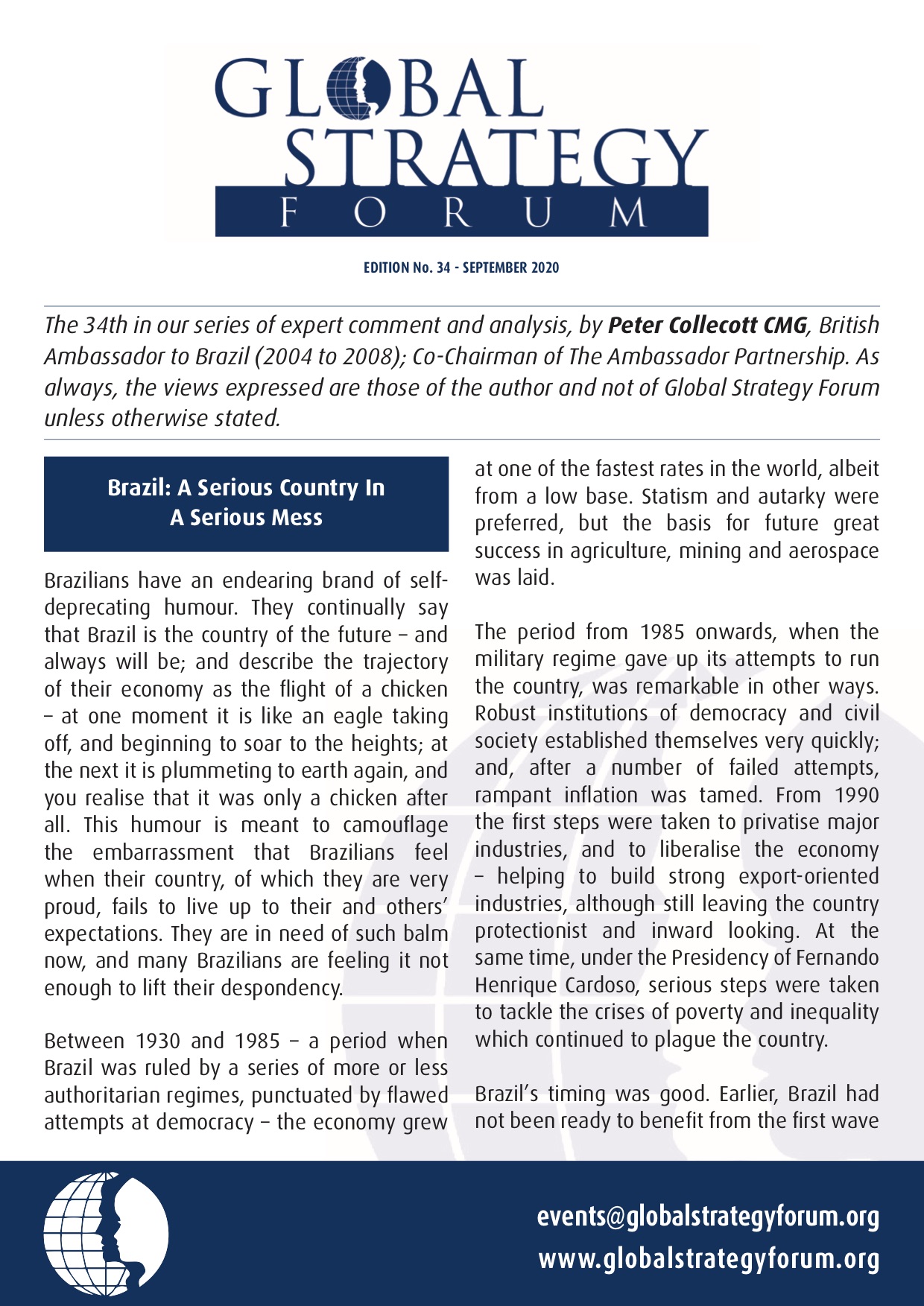 We have today published the 34th in our series of expert comment and analysis by Peter Collecott, British Ambassador to Brazil (2004 to 2008); Co-Chairman of The Ambassador Partnership. As always, the views expressed are those of the author and not Continue reading →