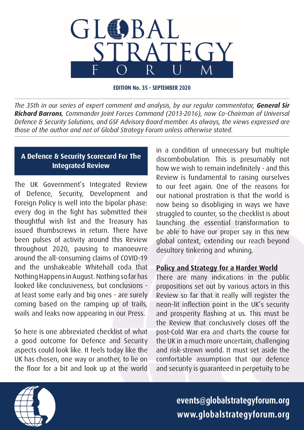 We are delighted to publish the 35th in our series of expert comment and analysis by GSF’s regular commentator and Advisory Board member, General Sir Richard Barrons. As always, the views expressed are those of the author and not of GSF unless Continue reading →